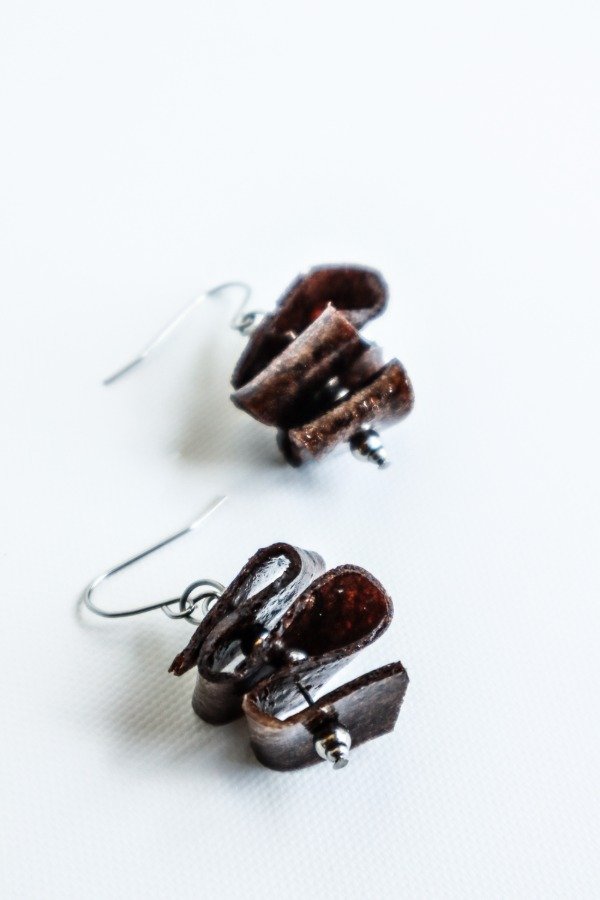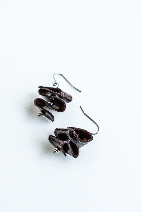 • Realizada en bioplástico a base de gelatina con agregados naturales que otorgan textura y color: restos de repollo. Con bolitas y enganches de acero quirúrgico.